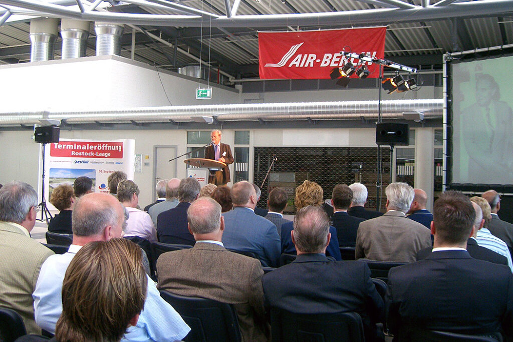 Die Fotos unten entstanden übrigens auf dem damals neu eingeweihten Flughafen Rostock-Lage (RLG). Im September 2005 reisten wir vom LPC dorthin zu einem Besuch des Jagdgeschwaders 73 “Steinhoff“. Teil des Programms war eine Podiumsdiskussion des LPC auf dem Zivilflughafen RLG zum Thema “Regionalflughäfen – Wohin soll die Reise gehen?” Am Pult begrüßte LPC-Präsident Peter Pletschacher.