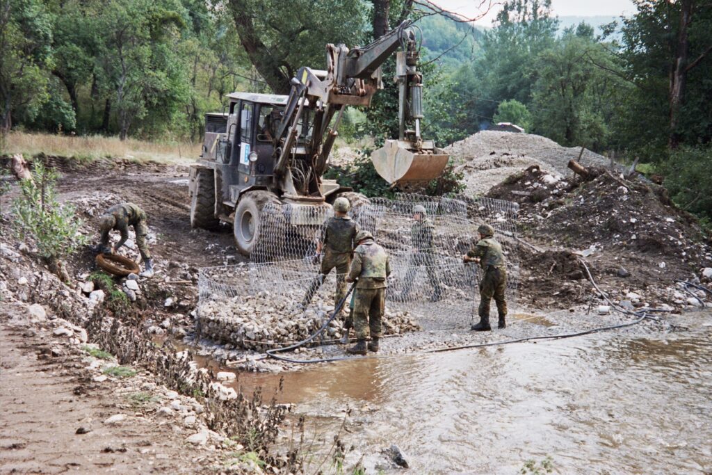 Der von den deutschen Pionieren errichtete Teilabschnitt liegt zwischen Ustikolina und dem rund 16 Kilometer entfernten Weiler Jabuka. Mit einem Unimog fahren wir diese Strecke hin und zurück. Eine der Herausforderungen für die uniformierten Straßenbauer besteht darin, in Ustikolina ca. 100 Höhenmeter zu überwinden. Um beim Baggern nicht durch Minen gefährdet zu werden, wird ein Pionierpanzer „Dachs“ eingesetzt, der unter anderem an seinem Teleskoparm mit so genanntem Tieflöffel sowie an seinem Räum- und Stützschild zu erkennen ist. In Jabuka errichten die deutschen Pioniere auch eine Brücke über einen kleinen Fluss. Zur Befestigung befüllen sie Drahtkörbe mit Schotter.